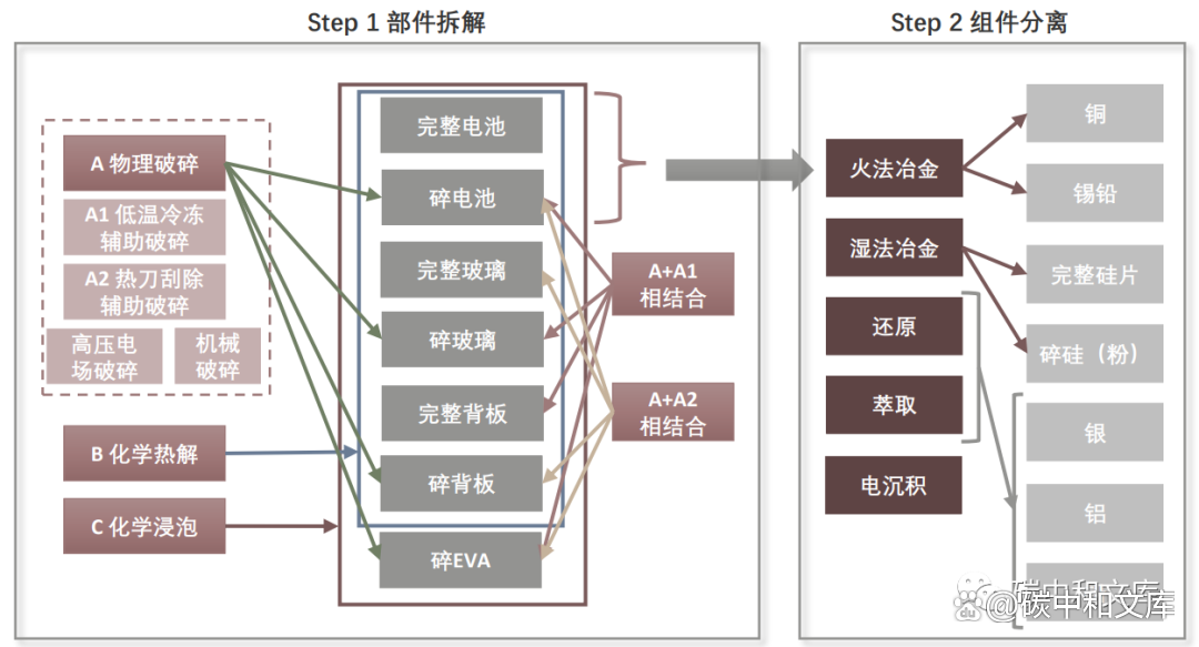 1)2021年10月21日,国家发展改革委、国家能源局、财政部、自然资源部、生态环境部、住房城乡建设部、农业农村部、中国气象局、国家林业和草原局十一部门联合印发了《“十四五”可再生能源发展规划》,提出推动退役风电机组、光伏组件回收处理技术与新产业链发展,补齐风电、光伏发电绿色产业链最后一环,实现全生命周期绿色闭环式发展。 2)2023年01月03日,工业和信息化部、教育部、科学技术部、中国人民银行、中国银行保险监督管理委员会、国家能源局六部门印发了《关于推动能源电子产业发展的指导意见》,提出鼓励开发先进适用的智能光伏组件,发展智能逆变器、控制器、汇流箱、跟踪系统等关键部件。加大对关键技术装备、原辅料研发应用的支持力度。加快构建光伏供应链溯源体系推动光伏组件回收利用技术研发及产业化应用。 3)2023年08月17日,国家发展改革委、国家能源局、工业和信息化部、生态环境部、商务部、国务院国资委六部门联合印发了我国首份系统部署退役风电、光伏设备循环利用工作的政策文件《促进退役风电、光伏设备循环利用的指导意见》,提出到2025年,集中式风电场、光伏发电站退役设备处理责任机制基本建立,退役风电、光伏设备循环利用相关标准规范进一步完善,资源循环利用关键技术取得突破。到2030年,风电、光伏设备全流程循环利用技术体系基本成熟,资源循环利用模式更加健全,资源循环利用能力与退役规模有效匹配,标准规范更加完善,风电、光伏产业资源循环利用水平显著提升,形成一批退役风电、光伏设备循环利用产业集聚区。