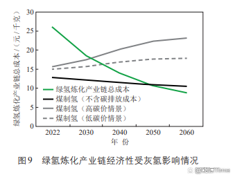 (5)灰氢成本也对绿氢炼化产业链经济性产生影响。碳价是灰氢前景展望中最大的不确定因素。高碳价情景下,碳排放成本将成为灰氢发展新的“痛点”,煤制氢LCOH将从目前的15.65元/千克增至2060年的23.15元/千克,绿氢炼化产业链经济性“拐点”预计出现在2030年前后。低碳价情景下,煤制氢LCOH将从目前的14.96元/千克增至2060年的17.84元/千克,绿氢炼化产业链经济性“拐点”预计出现在2035年之后。若不计入碳排放成本,煤制氢LCOH将从目前的12.85元/千克缓降至2060年的10.40元/千克,绿氢炼化产业链经济性“拐点”预计将推迟至2050年前后出现。详见图9。