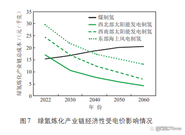 (3)电价对绿氢炼化产业链经济性产生影响。我国可再生能源储备丰富但分布不均,受技术水平影响,不同品种的可再生电力价格存在差异;受资源禀赋影响,不同区域的可再生电力成本也有差别。西北部地区太阳能发电成本低至200元/MW·h以内,绿氢炼化产业链总成本低至16元/千克左右,在计入灰氢碳排放成本的情况下,预计经济性“拐点”将在2025年之前到来。东部沿海地区,海上风电成本接近500元/MW·h,绿氢炼化产业链总成本被抬高至29元/千克以上,预计经济性“拐点”将在2040年左右出现。见图7。