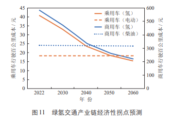 (7)照此推算,绿氢交通产业链总成本将在2030年降至35元/千克左右,2050年降至20元/千克左右。氢燃料电池汽车的燃动成本有望在2035年前后与柴油商用车平价竞争,也就是说,绿氢交通产业链经济性“拐点” 将提前至2035年前后到来。