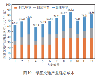 (3)当前我国绿氢交通产业链总成本区间在58~85元/千克,具体见图10;远高于氢燃料电池汽车示范应用城市群35元/千克氢气零售价目标。绿氢交通产业链经济性“痛点”主要存在于3方面,一是绿氢制取成本偏高,因此现阶段氢能交通领域主要使用工业副产氢;二是氢气长距离储运成本畸高,占据产业链总成本的12%~25%,而成品油储运成本(指贸易商成本)仅占产业链总成本8%左右;三是加氢成本占比在30%以上,规模越小的加氢站加注成本越高。