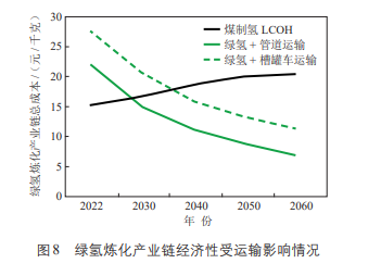 (4)运输成本对绿氢炼化产业链经济性产生影响。我国绿氢供需存在严重的空间不匹配,大规模制氢工厂建在可再生资源丰富的西部北部地区,而炼油化工企业多分布在沿江沿海地区。随着绿氢炼化产业的发展,绿氢大规模、跨区域运输将日益频繁,储运成本将构成绿氢炼化的另一“痛点”,对产业链经济性形成挑战。若制氢工厂距炼化工厂500km,制氢电价低于200元/MW·h,以管道运输,则绿氢炼化产业链总成本约为22元/千克,预计经济性“拐点”在2030年之前到来;若以槽罐车运输,则绿氢炼化产业链总成本接近28元/千克,预计经济性“拐点”在2035年之后到来。见图8。